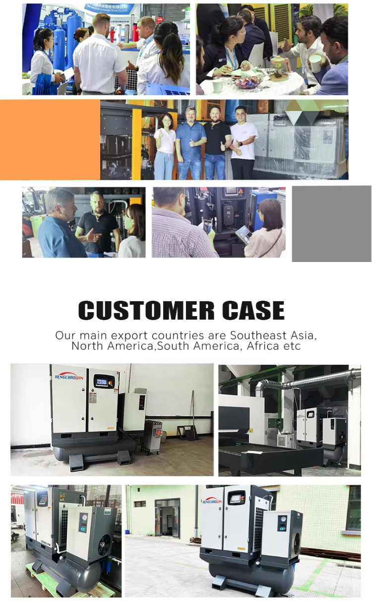 Many years of experience in production and export of screw air compressors, in compliance with EU CE standards, Southeast Asia ASME gas tank certificates and other requirements