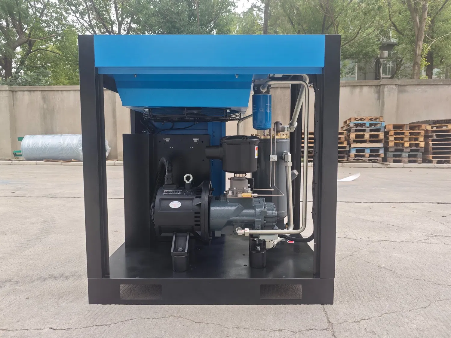 In addition, the screw air end and the PM motor share the same main shaft. The motor has no bearings. The rotor with permanent magnets is directly mounted on the extended shaft of the male rotor, and the transmission efficiency is 100%. This structure eliminates the fault points of the traditional motor bearing and realizes the maintenance-free motor.