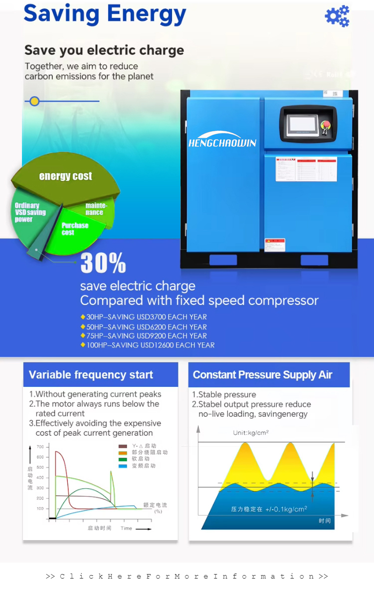 Hengchaowin permanent magnet variable frequency screw air compressor(PM VSD SCRW TYPE AIR COMPRESSOR) is a combination of permanent magnet rare earth synchronous motor (PM motor) and high-efficiency inverter to achieve 20-30% energy saving than ordinary screw air compressors