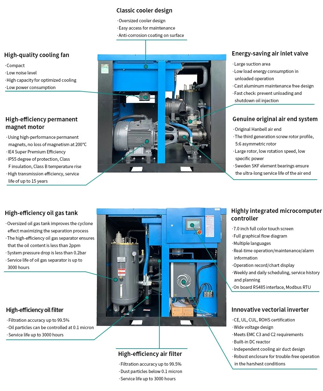 In addition, the screw air end and the PM motor share the same main shaft. The motor has no bearings. The rotor with permanent magnets is directly mounted on the extended shaft of the male rotor, and the transmission efficiency is 100%. This structure eliminates the fault points of the traditional motor bearing and realizes the maintenance-free motor.